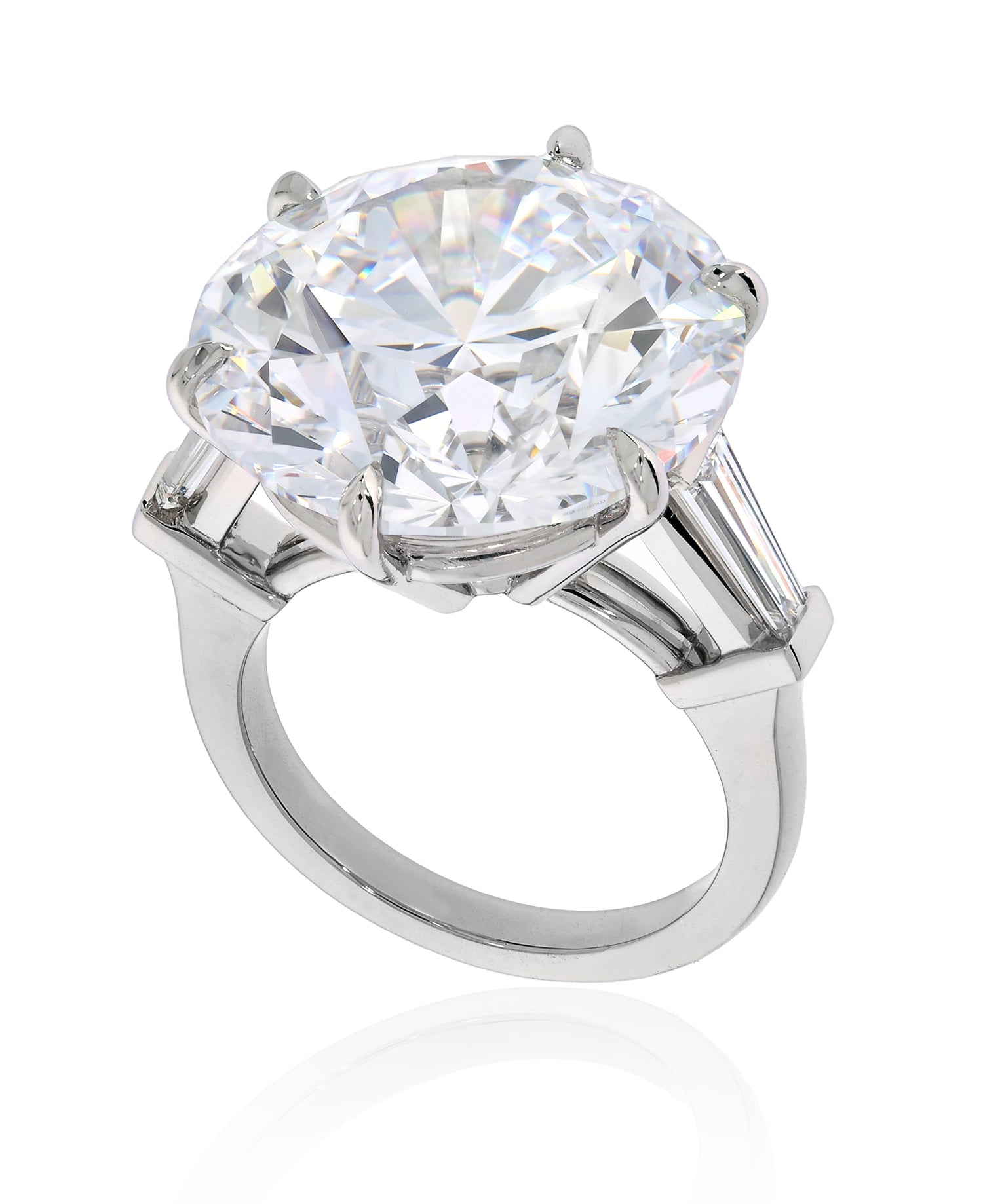 Exquisite 21+ carat D color, Flawless clarity, set in platinum ring with perfectly matched tapered baguettes. A rare treasure of elegance and beauty.
